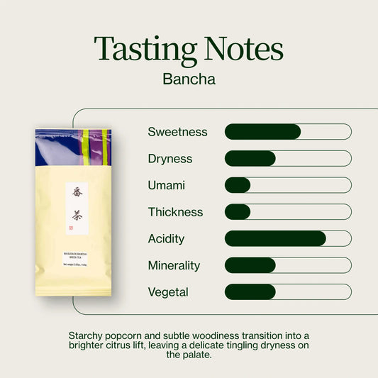 Le goût du thé vert bancha est un peu plus doux et terreux que celui de ses homologues plus jeunes. On peut noter des notes de bois, de céréales et même d'agrumes. Les notes boisées proviennent des tiges plus anciennes et plus épaisses utilisées dans le thé bancha, qui présentent même un peu d'écorce.